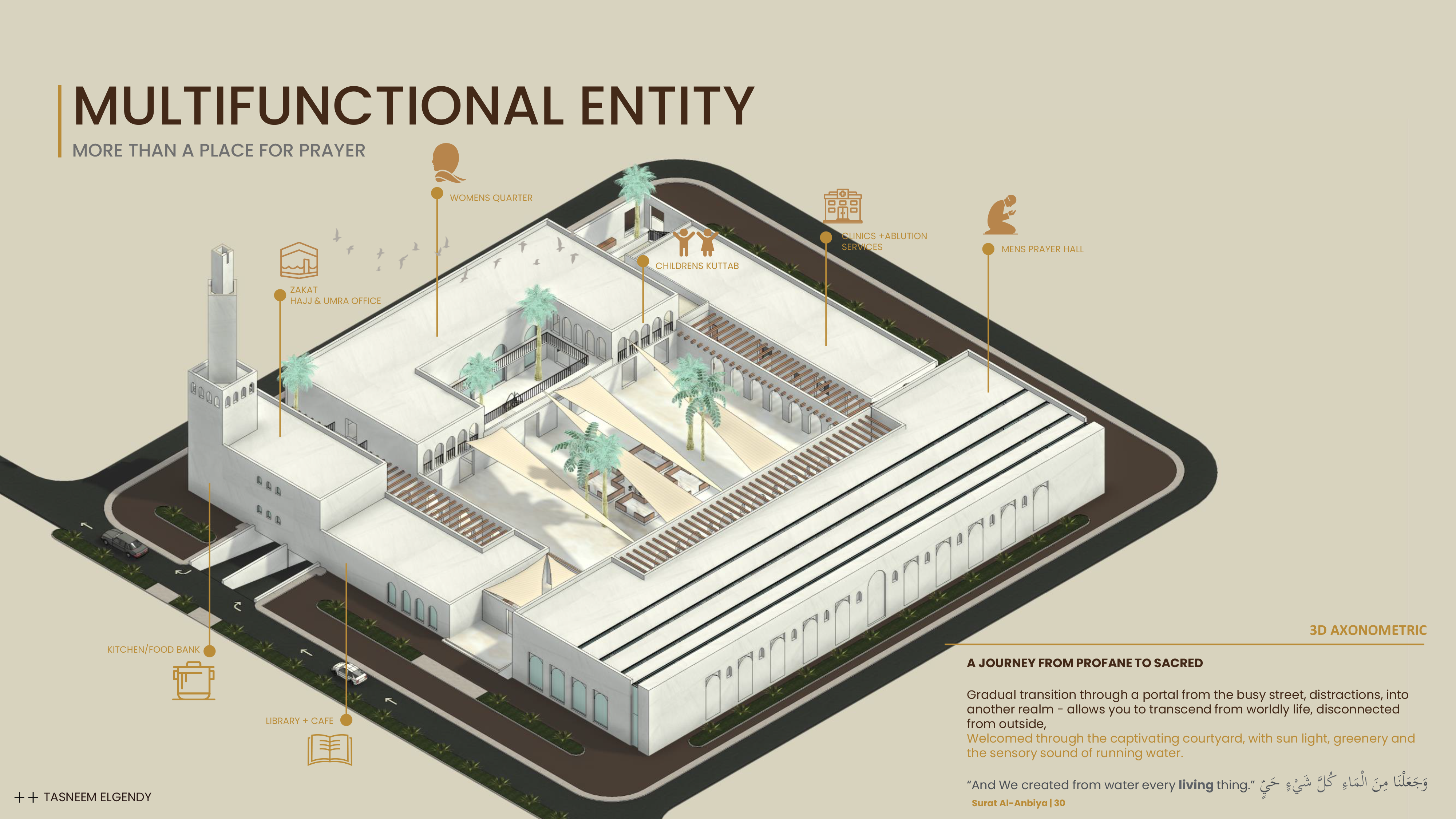 Architectural education must foreground theoretical inquiry, not as a peripheral supplement to design skills, but as a foundation through which creativity becomes socially responsible. When students examine how the power of design circulates through spatial production, they begin to design with intentionality—questioning inherited typologies, advocating for equitable access and forms of spatial inclusion. In the Spring of 2025, I tasked a cohort of seven students to design a women-inclusive masjid—they succeeded in developing a series of viable and contextually sensitive design proposals. Additionally, Tasneem Elgendy’s thesis “The Etymology of Mosque Architecture: Re-thinking Integrative Inclusive and Sustainable Design” received academic recognition for its research distinction in the College of Islamic Studies. (see the images included here)